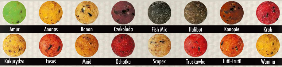 Включают в себя бойлы в расфасовке 100, 500 и 1000 г по 16, 18 и 20 мм. Выпускаются в следующих вкусо-ароматических вариациях: банан, персик, палтус, кальмар, конопля, креветка, кукуруза, лосось, мёд, тигровый орех, фрукты, скопекс, клубника, клубнично-рыбный, ваниль, фишмикс, краб, мотыль, фисташка, тутти-фрутти.