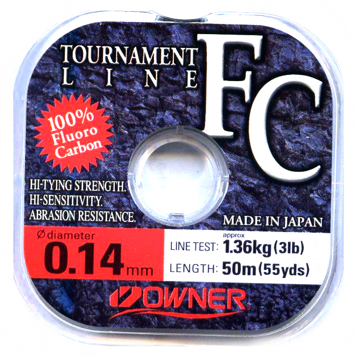 Флюорокарбоновая леска спортивного класса. Основное отличие флюорокарбона от обычных монофиламентных лесок состоит в том, что будучи помещенным в воду, за счет несколько иного угла преломления света, он становится практически невидимым со всеми вытекающими отсюда последствиями. Кроме того, флюорокарбон имеет несколько больший удельный вес чем вода, что обеспечивает его тонущие свойства. Флюорокарбоновая леска Owner FC предлагается в размотке по 50 метров в диаметрах от 0,14 до 0,31 мм.