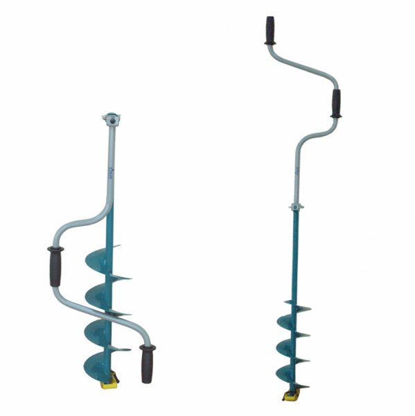 Основное и единственное отличие двуручных ледобуров от классических – верхняя рукоятка ледобура смещена относительно оси ледобура на 130 мм, а нижняя на 150 мм. Такое расположение рукояток позволяет вращать ледобур одновременно двумя руками, тем самым, увеличивая скорость бурения лунок во льду. Кроме того, существенно уменьшаются габариты ледобура в транспортном положении. По всем остальным характеристикам двуручные ледобуры полностью соответствуют классическим.