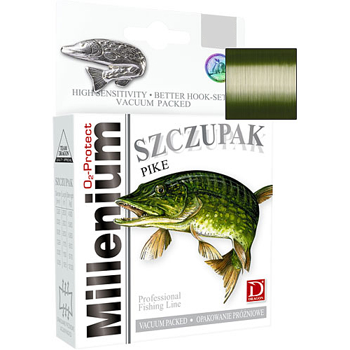 Millenium Szczupak (Щука) – мягкая спиннинговая леска. Позволяет делать далекий заброс. Характеризуется отсутствием склонности к деформированию и скручиванию. Ее небольшая растяжимость обеспечивает как прекрасное восприятие импульсов, передаваемых приманкой, так и амортизацию неожиданных рывков бьющейся рыбы. Леска темно-зеленого цвета.