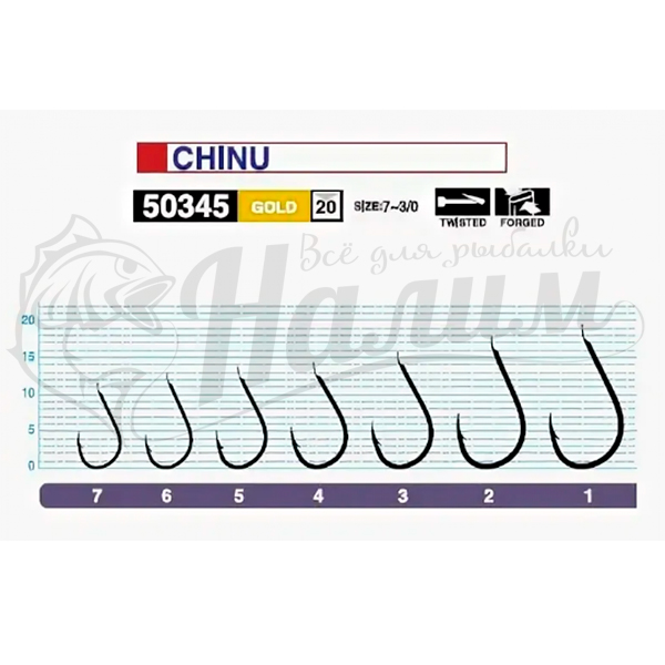 Четыре серии крючков Chinu объединены единым конструктивом – крючок с отогнутым жалом и специальная обработка "кованный поддев". Отличаются они только цветом покрытия. Широко используются для оснащения как поплавочных, так и донных снастей. Надежно удерживают самые разнообразные насадки как животного, так и растительного происхождения.
