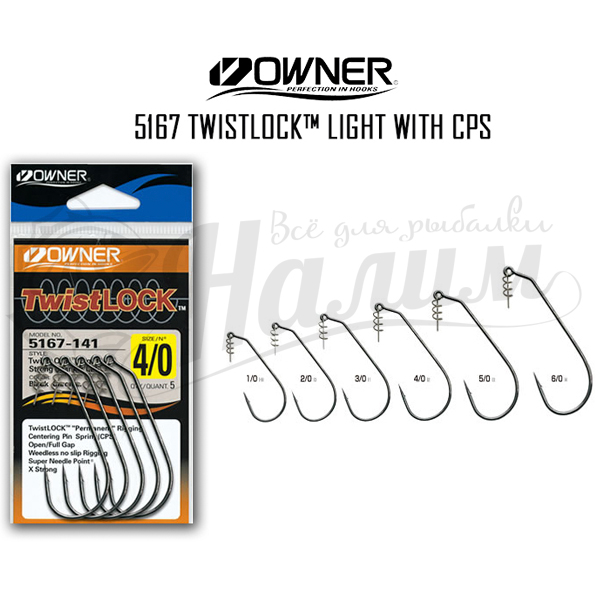 Принципиально от классических офсетников серия крючков OWNER 5167, получившая наименование Twist LOCK™, отличается тем, что не имеет привычной "ступеньки" - двойного изгиба цевья. Вместо нее для фиксации мягких приманок предусмотрено приспособление в виде короткой спиральки с направляющим стержнем Centering Pin Spring (CPS), свободно закрепленной в колечке на конце цевья. Идеальны для каролинской, техасской и дроп-шот оснасток.