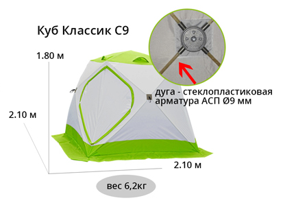 Высота палатки 180 см позволяет пользователю вставать в полный рост и минимизирует потерю тепла, так как пространство выше 180 см обычно не используется во время зимней рыбалки, но зато очень значительно поглощает накопленное в палатке тепло. Размер дна палатки «ЛОТОС Куб Классик С9» составляет 210х210 см, что положительно отличает данную модель от других аналогичных моделей кубических палаток, представленных на рынке. Аналогичные модели, при высоте конструкции 180 см имеют размер дна от 160 до 180 см. В модели «ЛОТОС Куб Классик С9» такой размер дна достигается за счет удлинения нижних боковых дуг палатки и наклона стенок. Наклон стенок позволяет значительно улучшить ветроустойчивость палатки, при этом уменьшается продуваемость тента ветром.