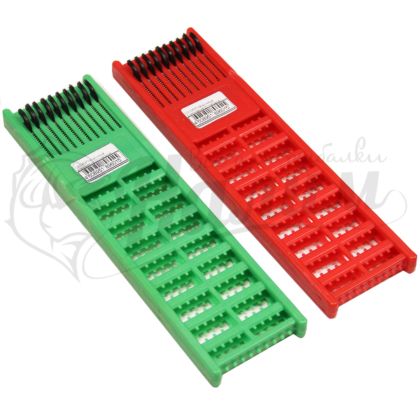 Удобная пружинная поводочница, изготовленная из пластика. Рассчитана на 20 поводков. Очень простая в использовании: петля поводка цепляется за крючок, потом этот крючок крепится к специальным зацепам.