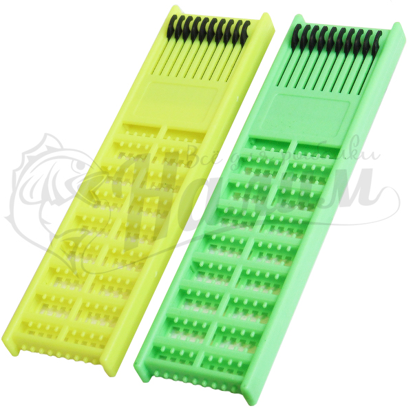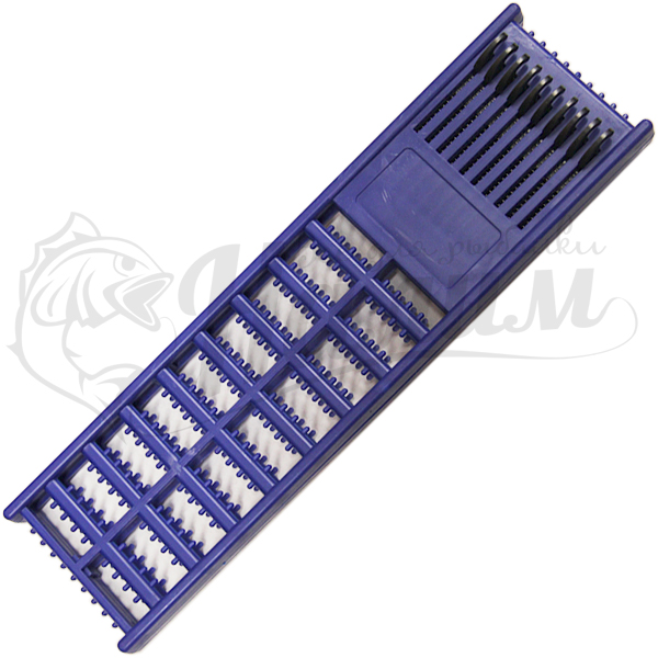 Удобная поводочница, изготовленная из пластика. Очень простая в использовании: петля поводка цепляется за крючок, потом этот крючок крепится к специальным зацепам. Всего можно хранить таким образом до 20 поводков (если вешать их по одному) длиной до 32 см.