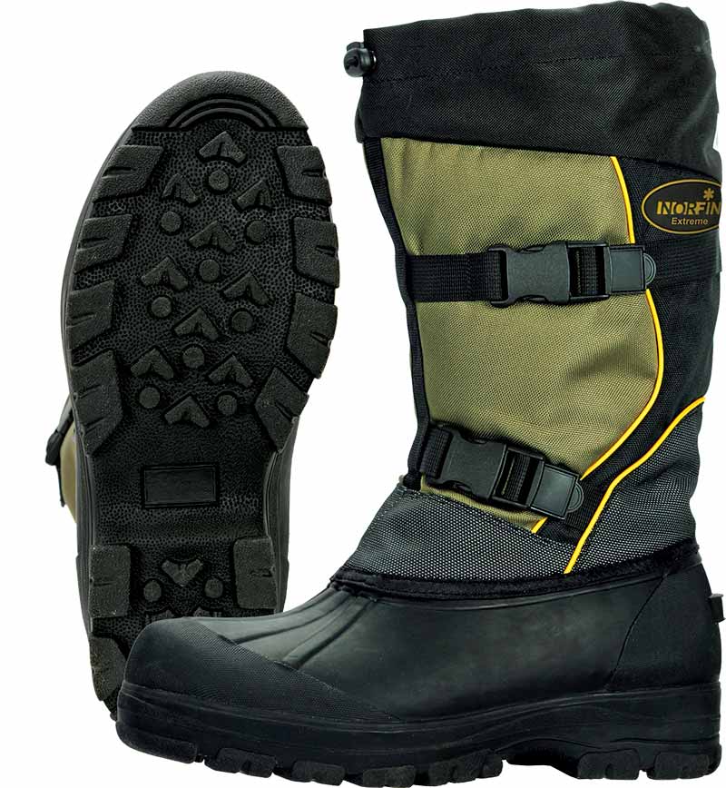 Зимние сапоги NORFIN EXTREME специально разработаны для рыболовов и любителей экстремального зимнего отдыха. Сапоги состоят из наружной и вынимаемой внутренней части. Верх сапог имеет защиту от попадания снега внутрь, снабженную кнопочным фиксатором. Голенища изготовлены из прочного нейлона 900D OXFORD, обработанного водоотталкивающим химическим составом DuPont™ Teflon ©. Для удобства и разгрузки мышц ног при длительной ходьбе на голенищах сапог имеются два регулируемых ремня с замками.