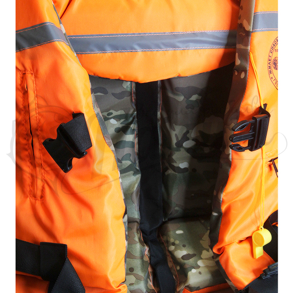 Жилет с высоким подголовником, распашной, застёгивается при помощи фастексов. Дополнительно оснащён светоотражающими элементами и свистком.