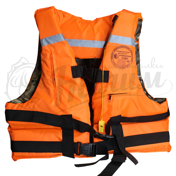 Жилет с высоким подголовником, распашной, застёгивается при помощи фастексов. Дополнительно оснащён светоотражающими элементами и свистком.