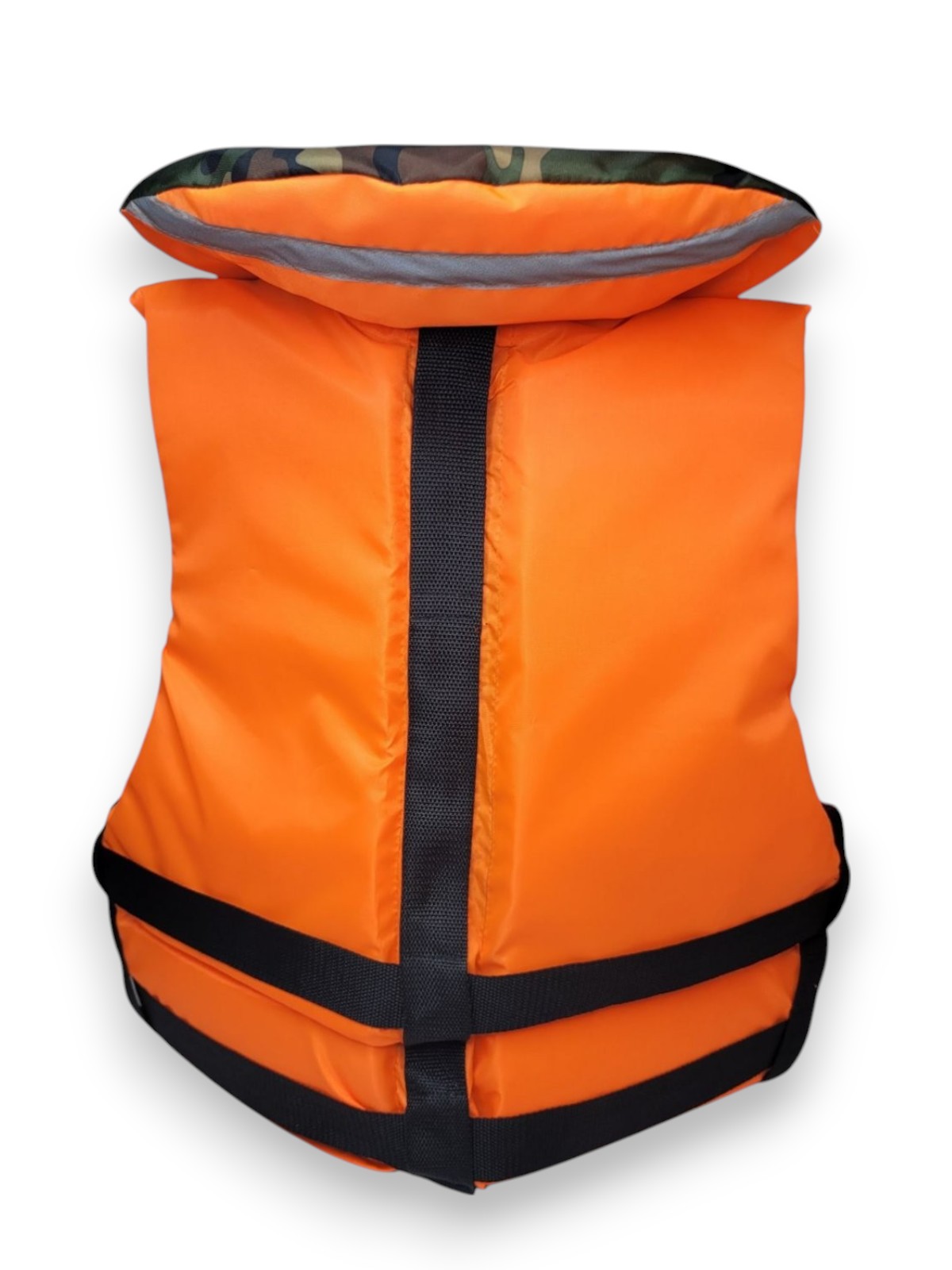 Жилет с высоким подголовником, распашной, застёгивается при помощи фастексов. Дополнительно оснащён светоотражающими элементами и свистком.