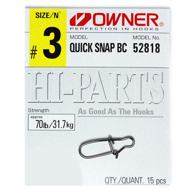 Очередная новинка от Owner - двусторонняя застежка Quick snap ВС. От предыдущих ее отличает исключительная прочность проволоки из которой она изготовлена и надежность конструкции. Кроме того, особое покрытие изделия обеспечивает безболезненное (без коррозии) использование ее в водоемах как с пресной, так и соленой водой. Широкий размерный ряд позволяет подобрать модель как для мелких, так и для крупных приманок и оснасток.
