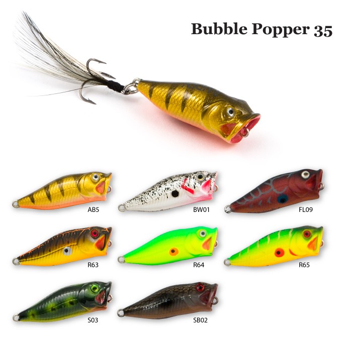 Воблер Raiden Bubble Popper 35 — эксклюзивный попер с двумя отверстиями в полости рта, что позволяет этой модели имитировать звук кормящейся с поверхности рыбы. Относится к классу ультралайт и пользуется большой популярностью у любителей этого деликатного вида ловли. Наряду с хищной рыбой ловит и относительно мирные породы рыб: густеру, леща, карася, красноперку, чехонь. Акустический. Плавающий.