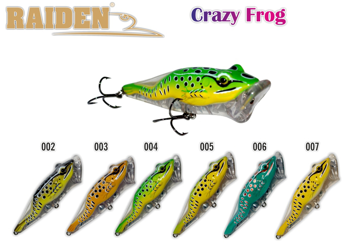 Воблер Raiden Crazy Frog 80 — оригинальный поппер в виде лягушки с увеличенной носовой частью в форме присоски. Хорошая анимация при любых проводках и высокие аэродинамические характеристики при забросе с успехом позволяют использовать Crazy Frog рыболовам даже с небольшим опытом ловли. Лопасть поппера имеет два симметричных отверстия, что делает его игру более заметной и дополнительно привлекает хищника. Акустический. Плавающий.