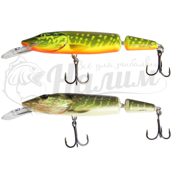 SALMO PIKE - один из самых популярных воблеров для ловли щуки, предлагается шесть типов: плавающий (F), мелководный (SR), плавающий двусоставный (JF), глубинный двусоставный (JDR), глубинный (DR), супер глубоко ныряющий (SDR) Предлагаются в плавающем варианте, размерами: 9, 11, 13 и 16 см. Все плавающие модели семейства Pike – лучшие приманки для ловли рыбу в неглубокой береговой зоне, на глубинах от 0,5 метров (Pike 9F и Pike 11F) до 3 – 4 метров (Pike 9SDR и Pike 16F). Проводку составной модели Pike 11 и 13, как и для всех приманок Pike, лучше делать медленной, немного изменяя ее скорость и делая частые паузы. При дальнем забросе приманки, вниз по течению реки и проводке против течения, делайте паузы и остановки вблизи интересных мест, или в местах с подводной растительностью, где хищник может сидеть в засаде.